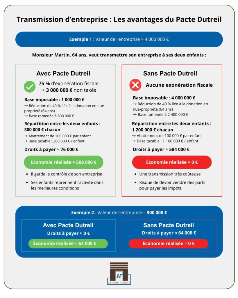 Pour illustrer l’impact concret du dispositif, prenons le cas d’un chef d’entreprise de 64 ans souhaitant transmettre son entreprise d’une valeur de 4 millions d’euros à ses deux enfants.